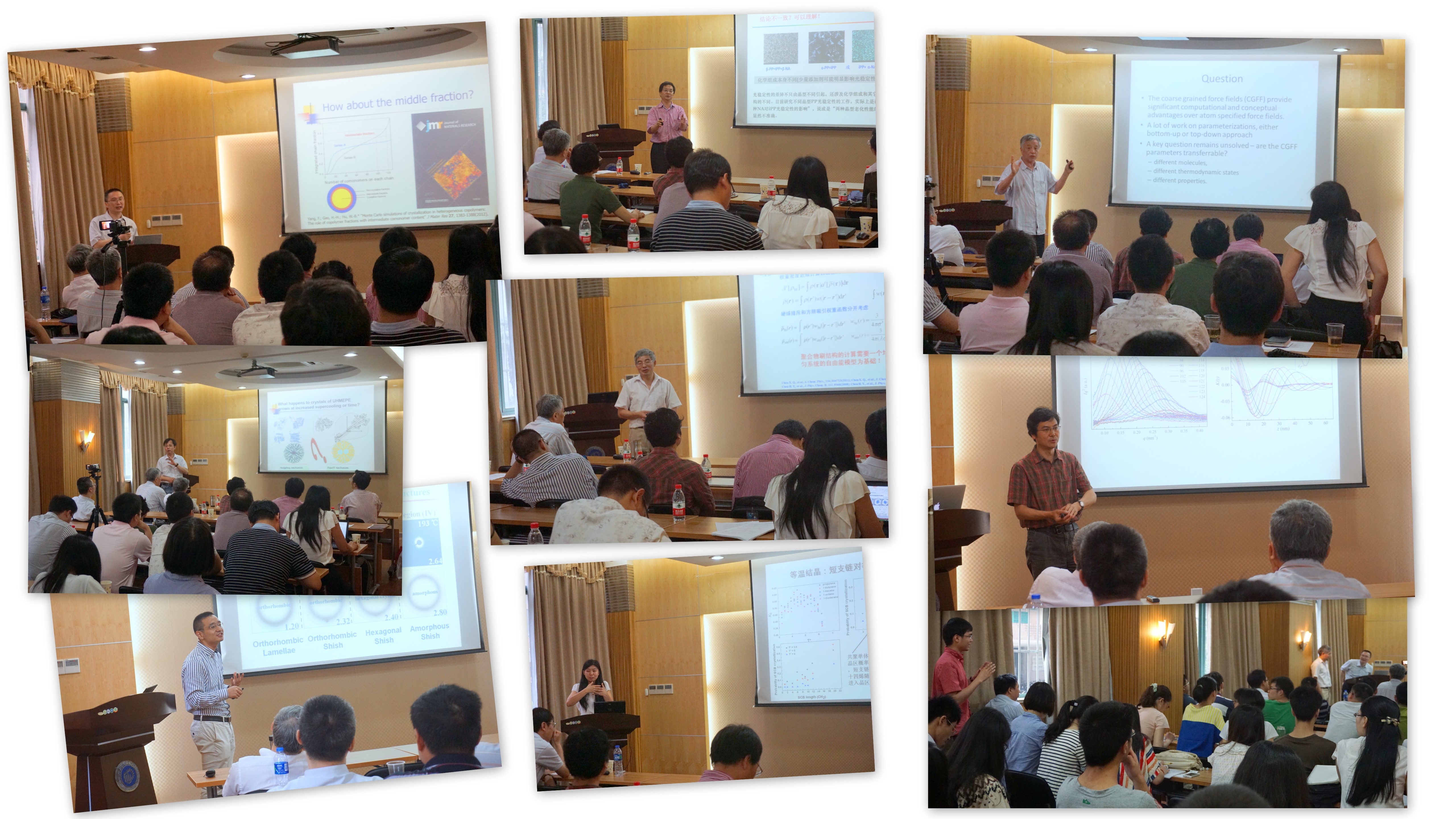 与会专家们分别从聚烯烃结晶机理的实验研究及分子模拟等方面给华理的师生们带来了八场高水平的学术报告。专家们的报告旁征博引,精彩纷呈,对聚烯烃结晶机理及影响因素、先进聚烯烃结晶表征手段、聚烯烃结晶的动态Monte Carlo及分子动力学模拟、粗粒化力场可迁移性等方面做了详尽的介绍,获得来自2138CC太阳集团、材料科学与工程学院以及化学与分子工程学院等的百余位师生的阵阵掌声,会场从早到晚始终座无虚席,师生们也积极讨论发言,与专家们共同探讨了聚烯烃结晶行为的分子模拟与实验研究的最新学术理论和技术,以及其对聚烯烃高分子挤出、注塑等生产工艺的重要指导意义。会议得到与会特邀嘉宾、企业专家和华理师生们的高度评价。