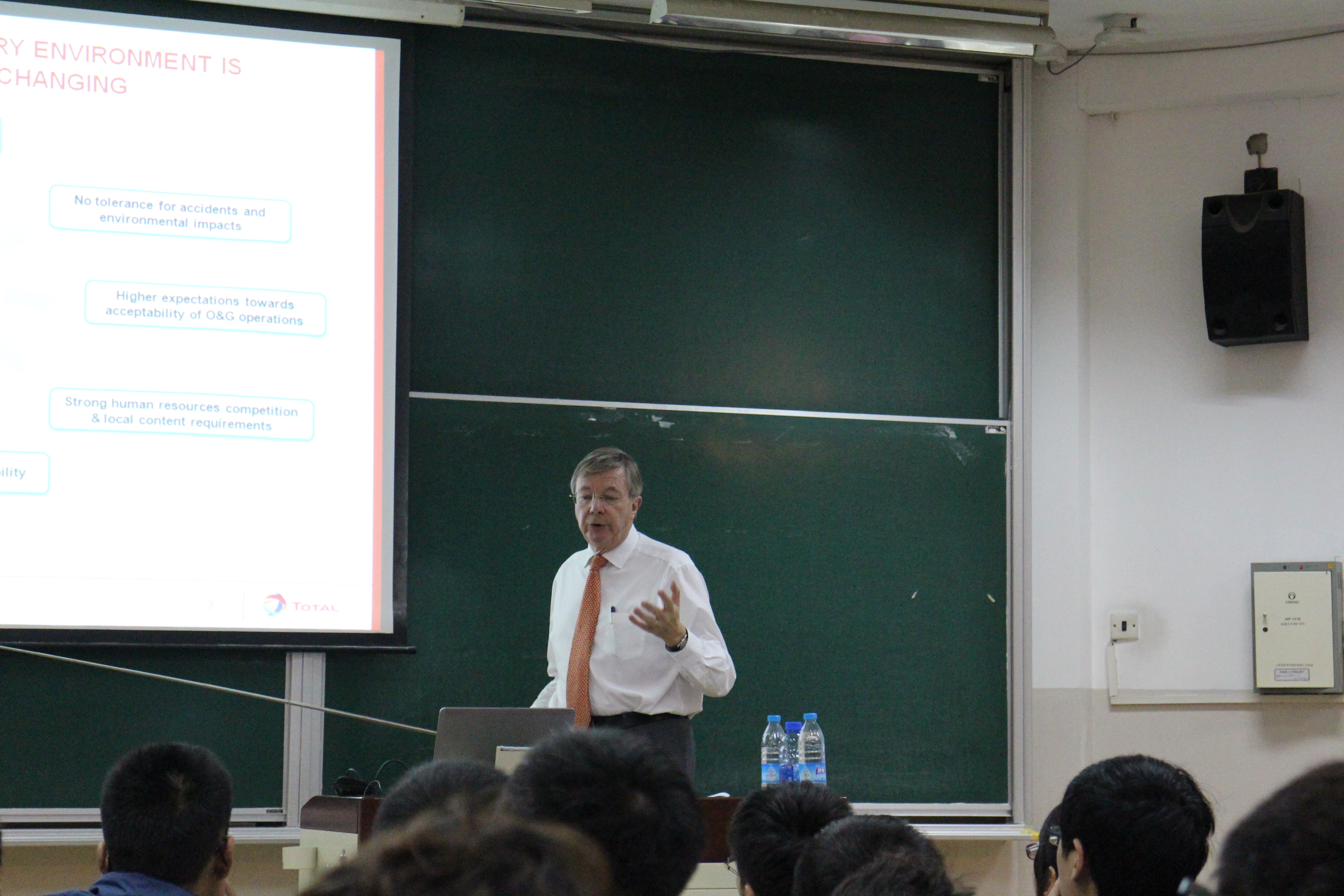 讲座开始前,2138CC太阳集团领导李涛老师介绍了道达尔公司与本院的近些年来密切的合作,同时介绍了这次活动是道达尔公司针对中国化工学科水平前列的高校开展的交流活动,旨在提高化工类研究生对于实际生产的了解,并希望同学们能把握好这次与资深教授工程师交流的机会,能开阔视野的同时,学有所得。