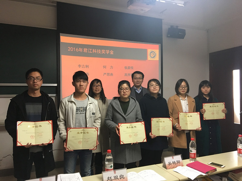吴艳阳介绍了君江奖学金设立的背景、评定的规则、跟踪流程等基本情况,并宣读了2015级6位“君江科技奖学金”的获奖名单,2013级、2014级共4名跟踪考察的“君江科技奖学金优秀进步奖”的学生名单,并转达了君江科技有限公司孙君同总经理的祝贺与期望。赵双良和吴艳阳为所有获奖的同学颁发了获奖证书。