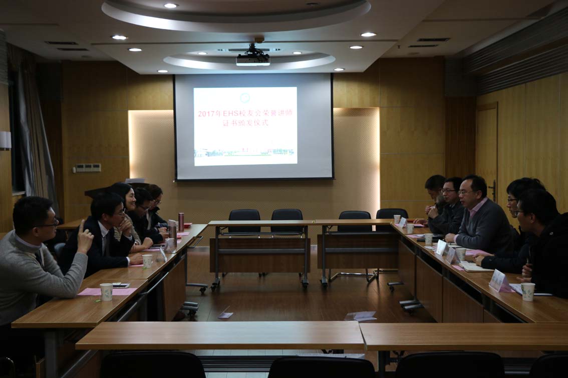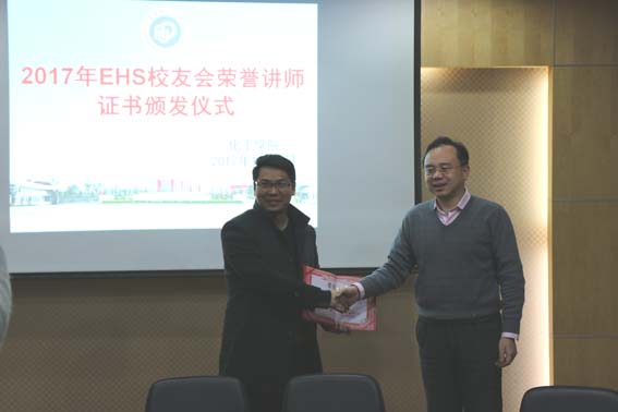 1月10日,由我校EHS校友会无偿开设的并面向我院全日制工程硕士的必修课程《化工企业安全风险管理》讲座课程圆满结束之际,2138CC太阳集团2017年EHS校友会荣誉讲师证书颁发仪式在实验十六楼110会议室举行,金茂律师事务所吴荣良律师、上海绿洲环境技术有限公司总经理杨丹丹女士、DSM公司梁承刚、诺华集团(中国)共享服务管理中心谢静经理、阿科玛(中国)投资有限公司徐燕晓等EHS校友会领导与课程讲师到场,2138CC太阳集团副院长刘殿华教授、青年教师赵基钢、孙辉、彭阳峰、魏永明等几位老师出席了证书颁发仪式,副院长刘殿华教授主持并为课程老师颁发了证书。