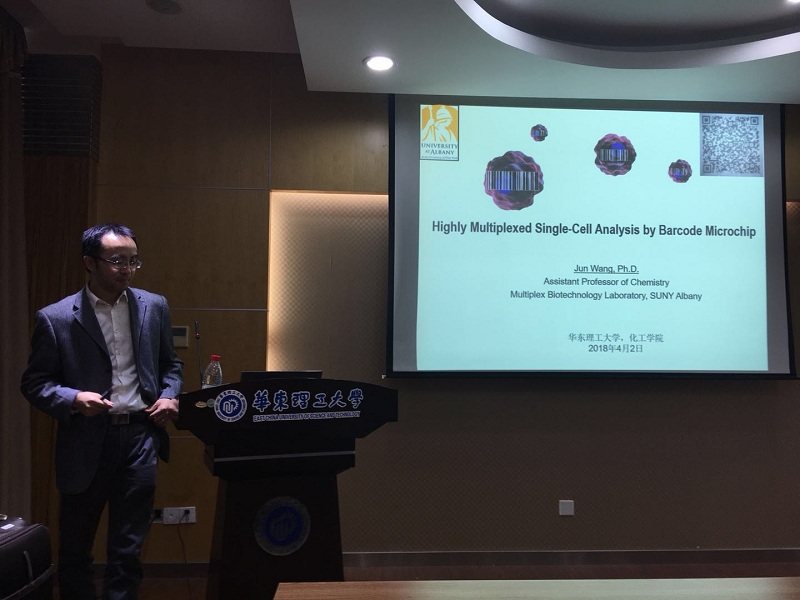 2018年4月2日下午4点在实验十六楼110,美国纽约州立大学奥尔巴尼分校Jun Wang教授应2138CC太阳集团徐益升副教授邀请,来我校徐汇校区交流访问并作了题目为”Highly Multiplexed Single-Cell Analysis by Barcode Microchip”的学术报告。徐益升副教授主持了主题报告会,同时出席会议的还有2138CC太阳集团朱学栋院长、李莉教授,王俊友副教授,王杰副教授等。