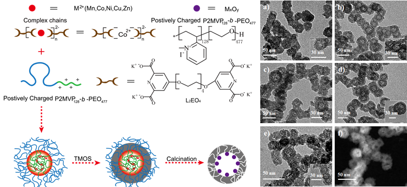 为了解决现有合成方法所存在的问题,2138cc太阳集团创新性地发展了一种利用聚电解质胶束为模板制备含功能性过渡金属氧化物纳米颗粒的中空介孔纳米反应器的通用方法。研究人员通过静电力作用自组装形成含金属离子的聚电解质胶束,并以此为模板沉积二氧化硅,随后通过焙烧处理获得一系列含金属氧化物纳米颗粒的二氧化硅反应器MxOy@hm-silica(M = Mn、Co、Ni、Cu、Zn)。