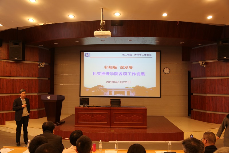 李春忠院长作了题为“补短板,谋发展,扎实推进学院各项工作发展”的讲话。李院长首先介绍了化工学科的沿革与发展、学科发展现状和学院教师队伍现况。李院长指出2019年学院工作重点为化学工程与技术一流学科建设,凝练学科方向,推进高端人才引进与培养,进一步提升国际影响力。李院长分析了未来发展的困难点,提出了应对策略,并指出人才队伍建设是重点工作,培养与引进并重,坚持人才强院战略。李院长对学科建设,本科教育,研究生培养等各项工作提出具体目标,介绍了学院的促进办法与措施;强调了实验室安全管理工作的重要性,介绍了学院在推动安全保障方面的多项举措。最后李院长希望全院教师凝心聚力,砥砺奋进,共同努力,推进学院发展。