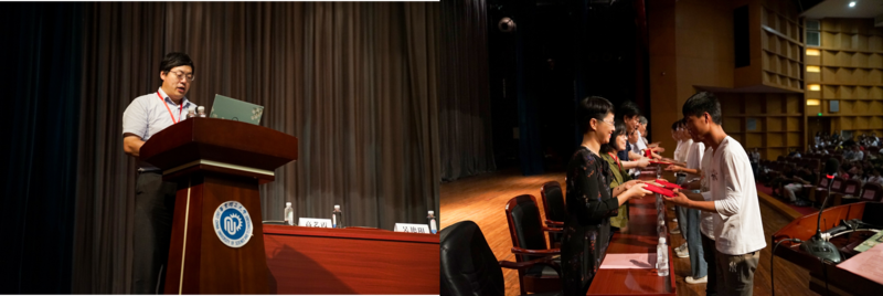 新老传承,感恩奉献。2018级学生代表时浩博和新生代表于清平相继分享自己的成长经历。时浩博希望学弟学妹们能够在未来的生活中勤于思考,用青春诠释誓言,以奋斗去寻找属于自己的答案谱写人生的辉煌。作为学校励志明德班一员的于清平,带着刚刚进校的懵懂和一往无前的锐气,勉励所有新生要有信心,有勇气,有梦想,有目标,记住新时代的使命与担当,不仅仅是海阔天空的追梦者,还要做脚踏实地的圆梦人。