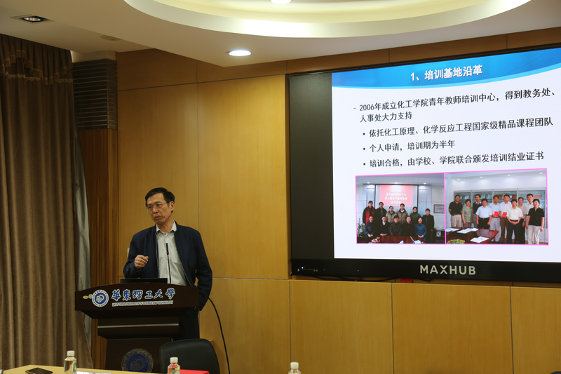首先,基地负责人许志美介绍了化工类青年教师教学能力培训基地的历史沿革。该基地于2012年成立以来,以2138CC太阳集团及资环学院的主要课程团队、实验中心及实习基地为依托,面向两个学院已培养了近60名青年教师。此外,许志美着重介绍了基地培训机制,每位青年教师在带教导师的指导下,逐一完成课程教学、实验教学、实习教学、教学论文以及工程设计能力的培训,旨在培养青年教师的教学素养和教学基本功。