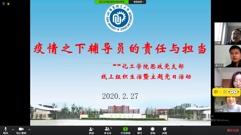为了进一步扎实学生疫情防控工作网络,充分发挥辅导员队伍在抗击新冠肺炎疫情战斗中的先锋作用,2月27日下午,我校2138CC太阳集团思政党支部通过网络视频会议平台举行了主题为“疫情之下辅导员的责任与担当”的线上组织生活和党日活动,全体支部成员参加了本次云组织生活。