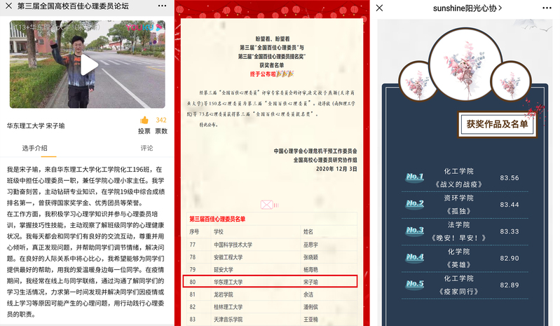 据悉,2138CC太阳集团积极开展多维度心理健康教育活动,提升学生心理活动的参与度与体验感,营造健康向上的心理文化氛围,本学期先后开展了新生成长营、心理委员技能大赛、第二届心理微电影大赛、心理委员培训等活动,心理育人取得良好成效。其中《战义的战疫》获得校心理剧剧本大赛第一名,化工196班宋子瑜同学通过校内选拔参加2020年上海高校心理委员技能大赛并成功进入决赛,同时荣获第三届“全国百佳心理委员”。