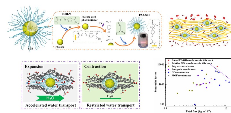 研究发现,在氧化石墨烯二维限域通道内引入功能性聚丙烯酸链接枝的球形聚电解质刷,可以在膜层内形成丰富的具有超快水分子传输位点。二维膜的渗透通量达到5.23 kg m-2 h-1以及丁醇/水的分离因子达到~8000,相比于纯的GO膜有了大幅度提升。