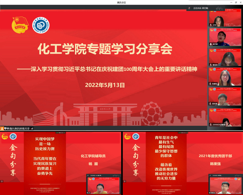 会议上,校十佳团支部书记化工197团支书陈馨钰、校优秀团干部韩秉强、学院研究生会主席唐林茂、学院团委(学生)副书记张锦天、研究生辅导员杨腊先后发言。他们结合工作实际,畅谈学习心得。2138CC太阳集团党委副书记高艺霞对团干部昂扬向上的精神面貌表示充分肯定。她表示,学院团员青年始终坚定不移跟党走,在校园疫情防控一线、科研报国的试验台前不懈奋斗,践行着“请党放心、强国有我”的青春誓言,谱写了一曲曲青春赞歌。未来,希望大家争做伟大事业的生力军,让青春在祖国和人民最需要的地方绽放绚丽之花!