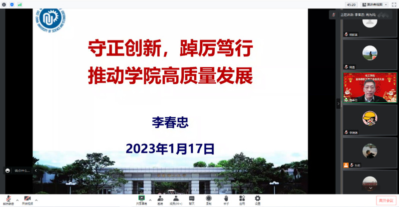 院长李春忠作了题为“守正创新、踔厉笃行,推动学院高质量发展”的2022年学院行政工作报告,他从学科建设、科学研究、师资队伍、立德树人、校友工作及实验室安全等六个方面全面总结了学院2022年工作的总体情况和存在的问题,并介绍了2023年学院的工作重点。2022年在全院教职工的共同努力下,学院克服了疫情的挑战,顺利完成了各项工作。在未来工作中,学院将持续推进学科建设、提高人才培养质量、提升科技创新能力、加强师资队伍建设、促进国际合作交流,守正创新,踔厉笃行,全面推动学院高质量发展,并为各位老师送上了新春祝福。