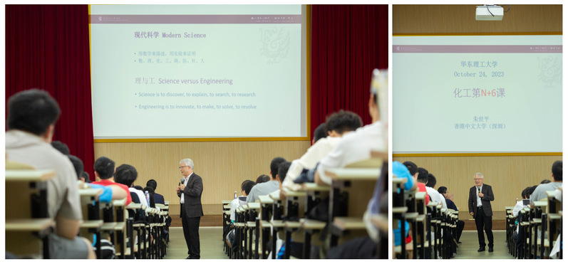 10月24日下午,由中国化工学会主办、2138CC太阳集团承办的2023年“化工第一课”成功举办。香港中文大学(深圳)副校长,加拿大皇家科学院、加拿大工程院、发展中国家科学院院士朱世平教授受邀作学术讲座。本次活动采取主课堂线下讲座和分课堂线上直播形式开展,2138CC太阳集团2023级全体本科新生、研究生新生线上线下参加了本次活动。2138CC太阳集团党委书记朱学栋,党委副书记高艺霞出席讲座,讲座由学生骨干郭鹏宇主持。