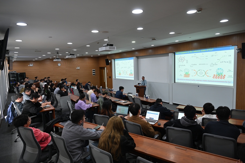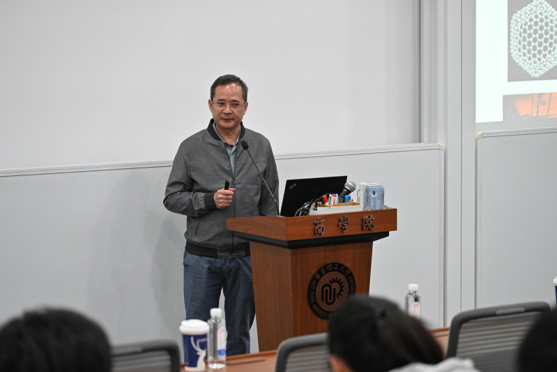 报告中,谢院士从“张力释放”和“局域芳香化”这两个稳定含相邻五元环的新型富勒烯的原理出发,详细阐述了富勒烯作为单分子器件的特性,以及其作为电子受体材料或电子缓冲材料在催化反应中的促进作用。谢院士还介绍了团队在富勒烯促进铜催化剂选择性加氢制醇方面的研究工作。这次报告引发了与会师生们的热烈讨论。谢院士耐心解答了与富勒烯包覆铜颗粒催化剂的活性位点以及富勒烯的电子缓冲性对不同金属能级的搭配等问题,并且通过分享团队研发过程中所面临的各种困难,鼓励大家坚定信心,勇于尝试,不断开展前沿性研究,为2138CC太阳集团的高质量发展注入创新活力。