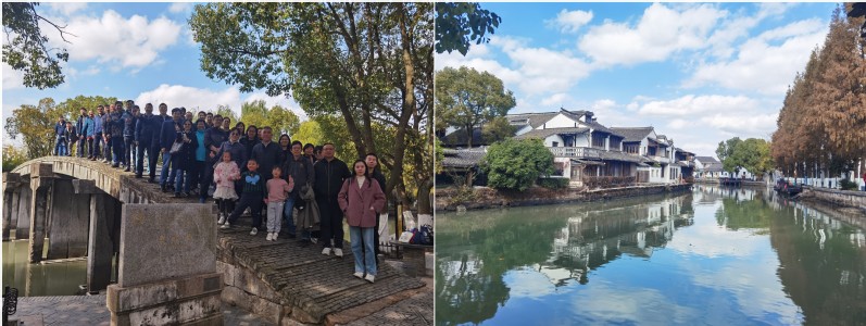 秋景引闲步,山游不知疲。午后,老师们来到素有“江南第一桥乡”美誉的金泽古镇。一路经过普庆桥、普济桥、如意桥、金泽放生桥,一座座古桥分别横架在市河及其支流上,仿佛来到了那个“出门即过桥,人家尽枕河”的人间江南。沿着青石板,最后停步在了迎祥桥。迎祥桥在元、明时代是古镇经济繁荣的中心,各路农产品和经济作物均在迎祥桥两岸集散,人来人往,川流不息。