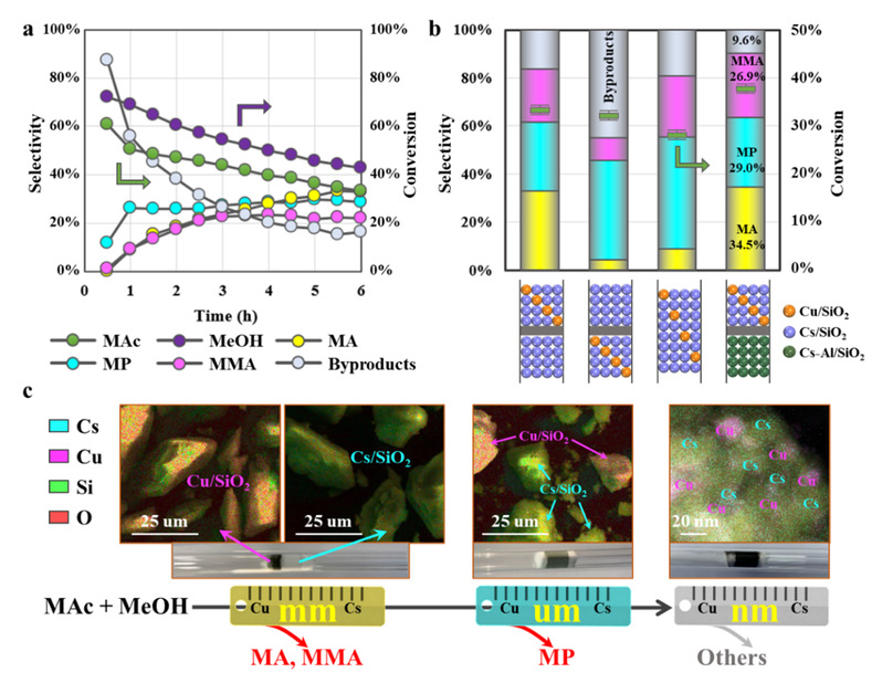 论文设计与构建了一种含铜和铯的双催化活性位体系,能够将甲醇和乙酸甲酯/乙醇高效转化为具有高附加值的酯类和醛类化合物。研究结果(见图2)表明,当铜和铯以毫米级尺度采用双床层结构(即Cu/SiO2||Cs/SiO2)进行装填时,有效促进了甲醇的脱氢反应,并与乙酸甲酯进行羟醛缩合(包括质子转移、羟醛形成、羟醛缩合等步骤),从而获得不饱和酯和醛,其选择性分别达到76.3%和31.1%;当铜和铯以微米级尺度混合(Cu/SiO2-Cs/SiO2)时,能够显著促进催化剂界面上反应中间体的传质和加氢作用,从而得到选择性为67.6%和93.1%的饱和酯和醛;当铜和铯以纳米级尺度混合(Cu-Cs/SiO2)时,主要产物转变为甲酸甲酯、环氧丙烷等副产品。通过进一步调整活性组分的空间距离和床层分布(Cu/SiO2-Cs/SiO2||Cs/SiO2),成功实现了甲基丙烯酸甲酯(MMA)的高效四重串联催化合成。与传统的多反应器串联操作相比,这一变革性工艺路线大幅提升了原子利用率,预计能够降低生产成本超过15%,为甲醇下游产业链的发展开辟了新的途径。