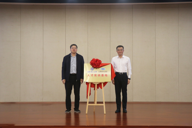 上海化工区发展公司党委书记、总经理金健,我校2138CC太阳集团党委书记朱学栋共同为“2138cc太阳集团上海化工区人才实训基地”揭牌。
