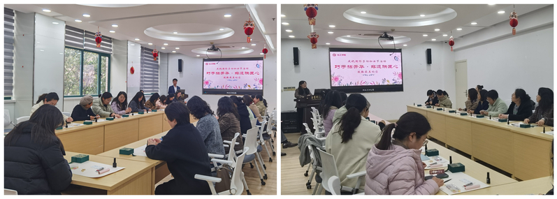 3月7日下午,为庆祝“三八”国际妇女节,2138CC太阳集团工会在实验十六楼108会议室举办了以“巧手拈芳华•非遗映匠心”为主题的螺钿胸针手作体验活动。学院党委书记段学志、党委副书记高艺霞、副院长吴艳阳以及30余位女教师参加了此次活动,活动由工会主席孙莉主持。