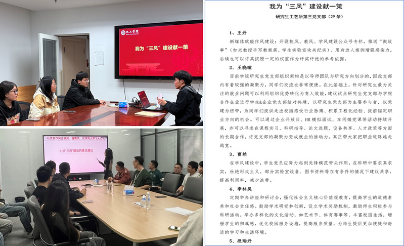 “大建言”环节,坚持服务发展。领导干部、师生党员在深入讨论的基础上,聚焦校风、教风、学风建设中的痛点难点,结合学校和学院的具体情况,提出具有针对性和建设性的意见与建议,引导党员、干部积极主动服务学校、学院发展,推动校风、教风、学风建设取得实质性进展。学院党委也将对征集到的意见、建议进行整理和分析,结合实际制定针对性的改进措施。