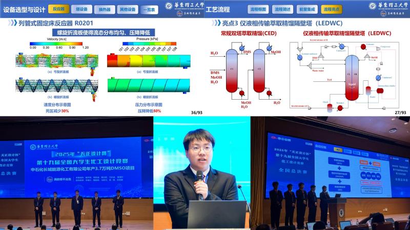 2025年的竞赛的内容是“为某大型化工企业设计一座二甲基亚砜清洁生产的分厂,要求技术符合我国绿色低碳循环发展要求”。我校团队以某厂生产废气中的硫化氢为原料,采用二氧化氮氧化法设计了年产3.7万吨二甲基亚砜项目。历经7个月,团队成员从项目可行性研究、工艺方案比选论证、流程搭建、设备设计及选型、自动控制、总图布置、车间布置、安全评价、经济分析等多个方面,对项目进行精心设计,大胆应用四大创新:反应器结构创新、过程强化技术创新、分离技术创新、过程设备创新,符合中国制造2025的要求。团队的5位指导教师为李瑞江、陶国忠、马宏方、雷明、彭阳峰,另有沈荣春、魏永明、杨座国、杨敬一、黄子宾及袁佩青等6位教师深度参与了竞赛指导。2138CC太阳集团党委书记段学志、副院长周兴贵、吴艳阳等非常关心队伍的备赛情况,并从工艺路线、反应器设计、现场答辩方法等方面提出了宝贵建议。